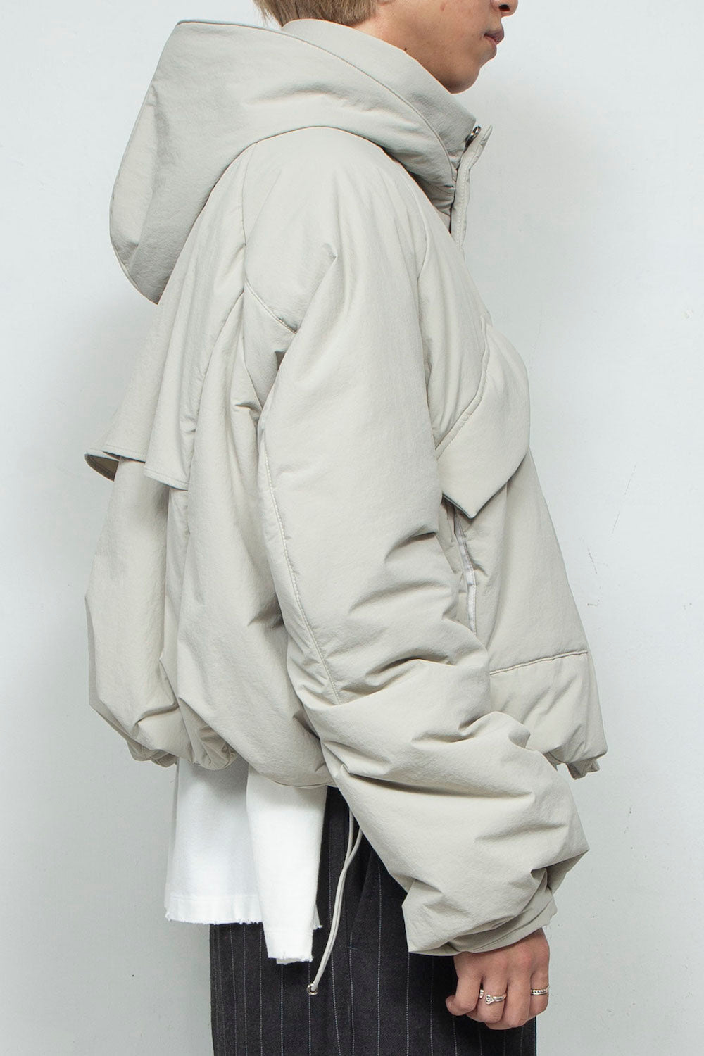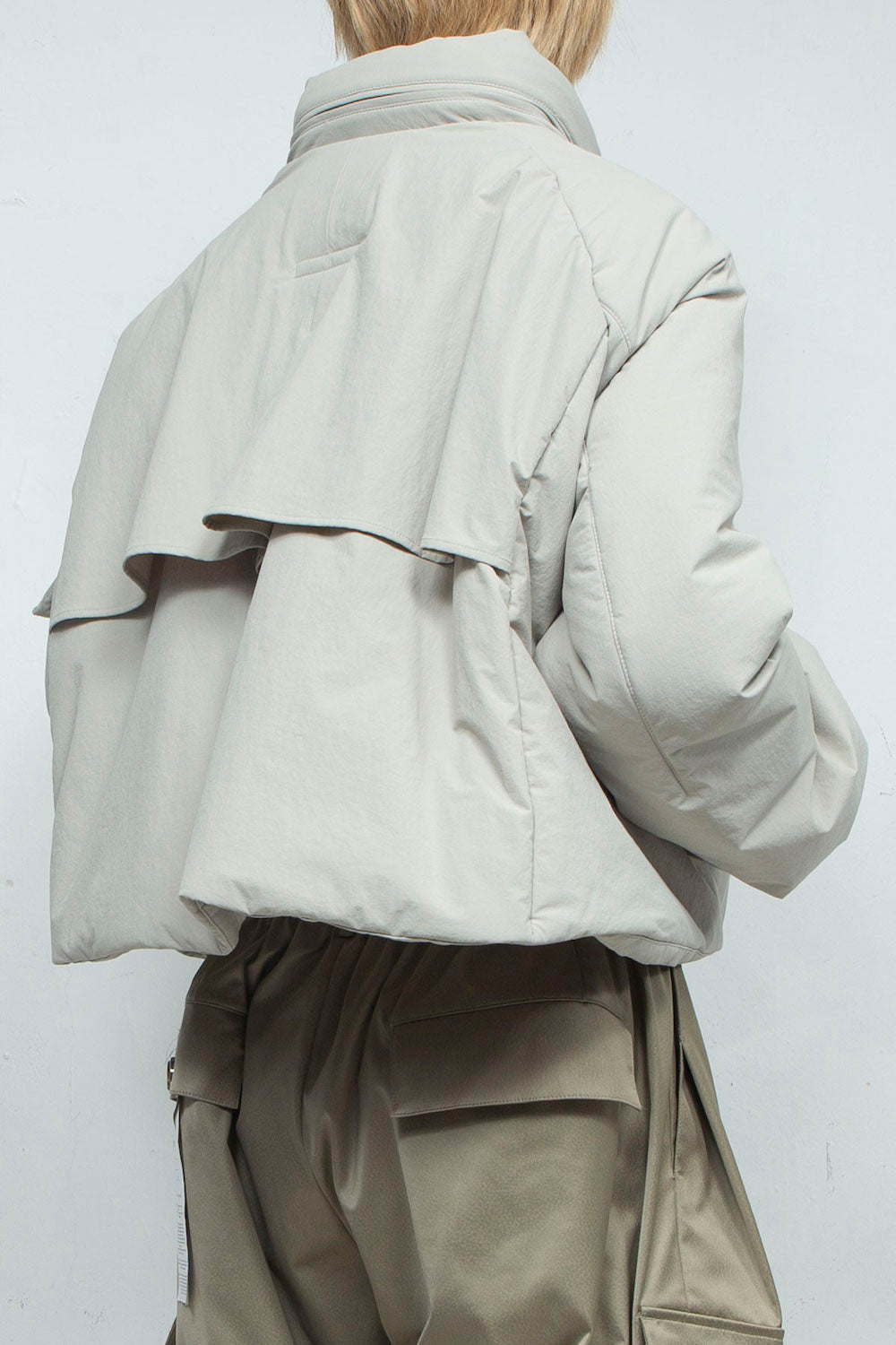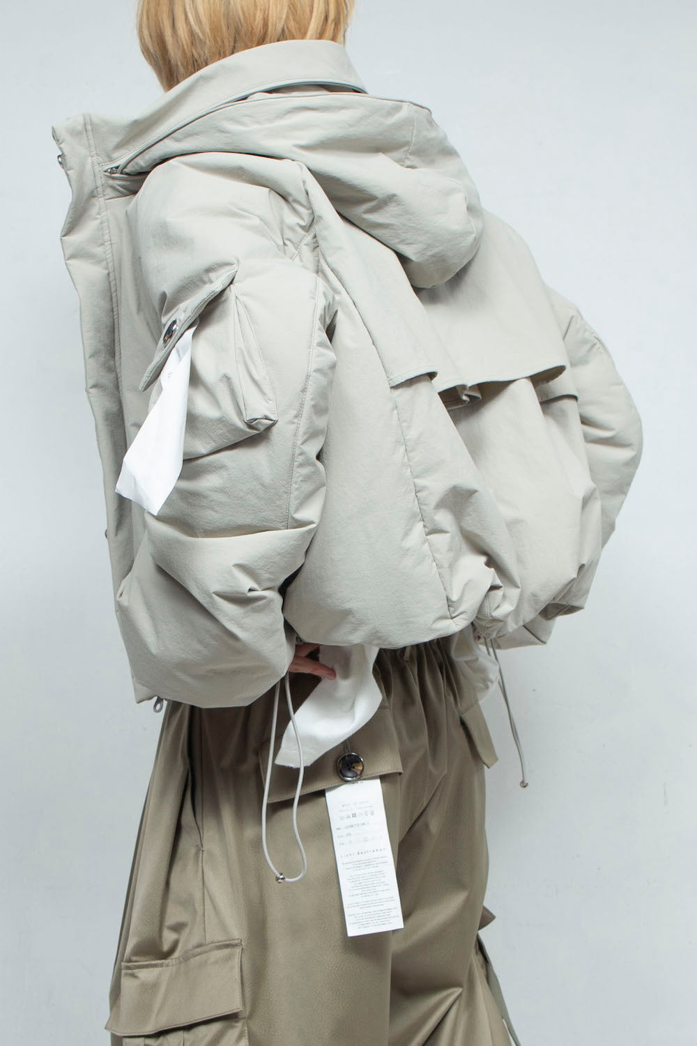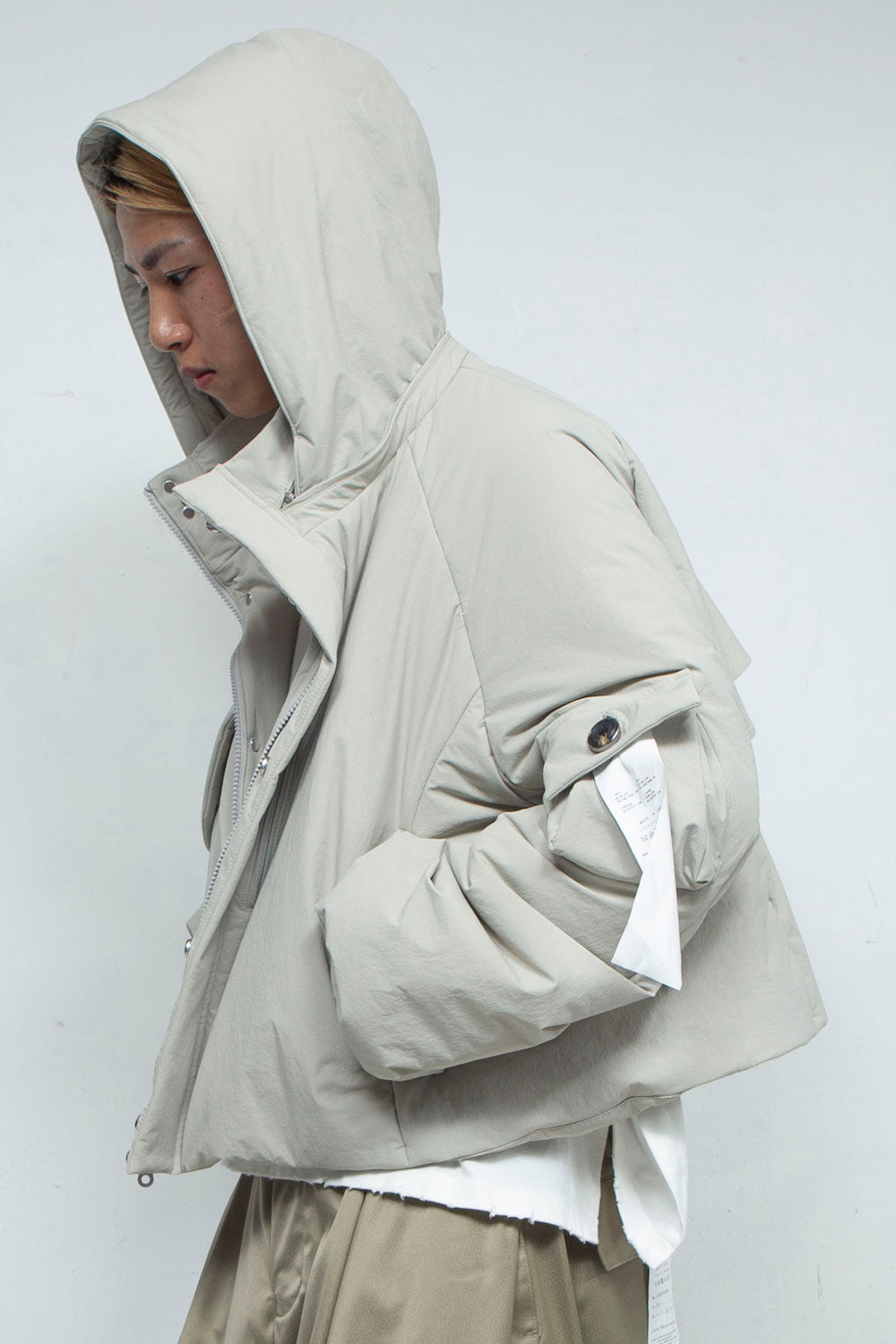A padding short blouson from the "Onibegie" series made from recycled nylon onion skins.