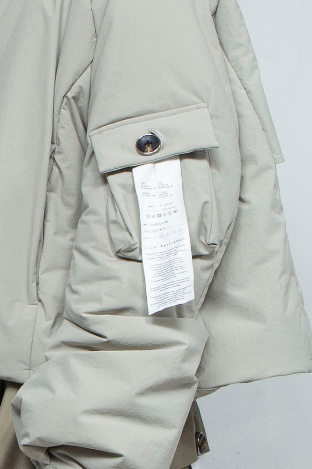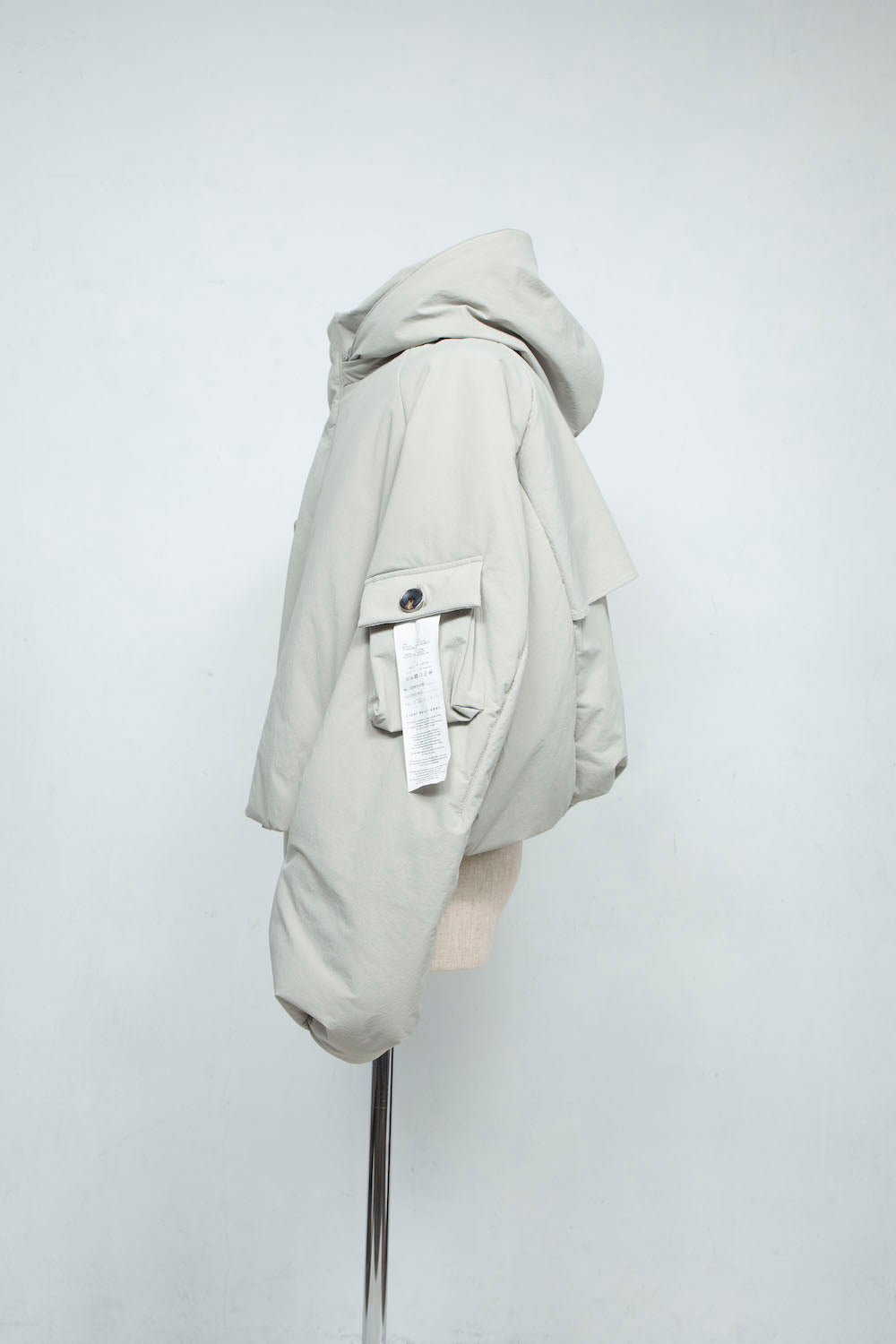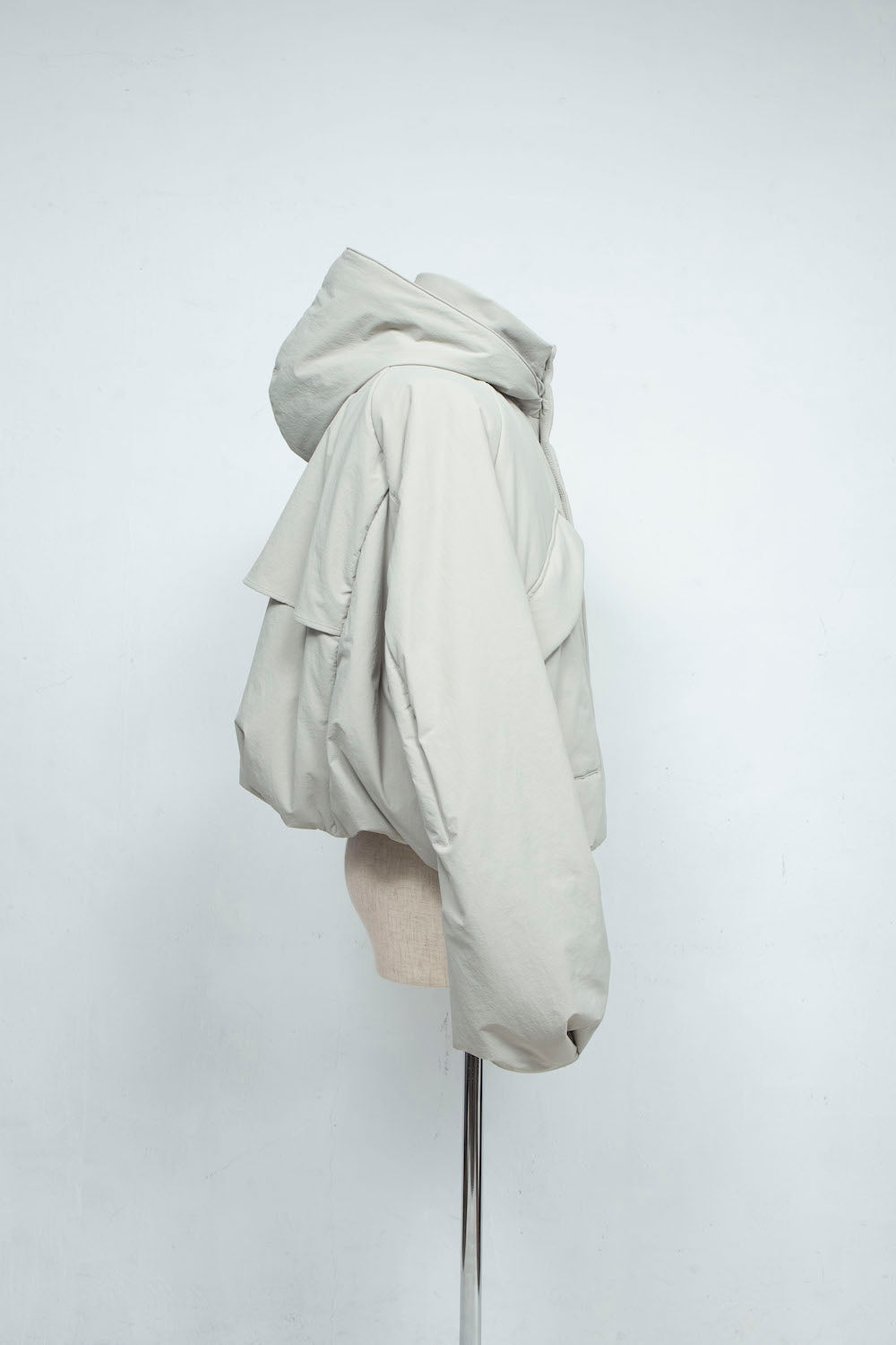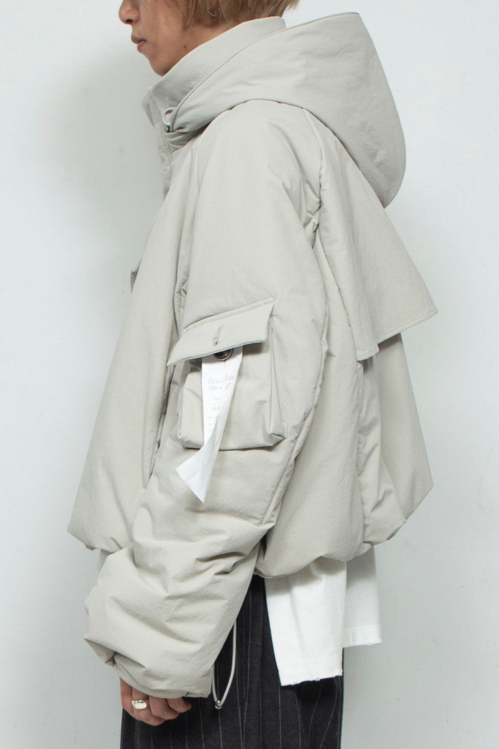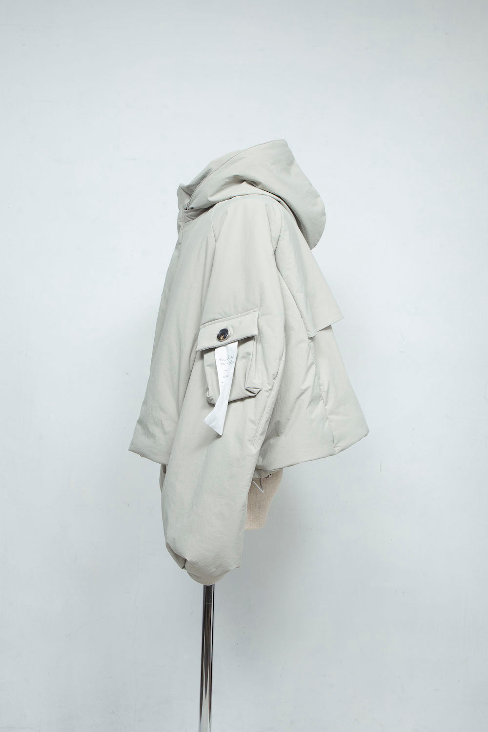 A padding short blouson from the "Onibegie" series made from recycled nylon onion skins.