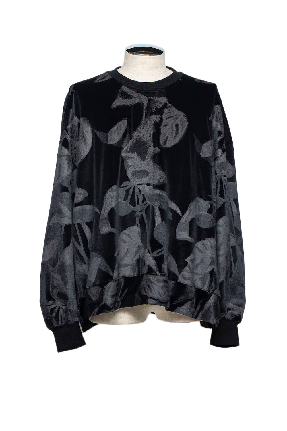 This new crew neck side vent pullover is made from original velour jersey with a special two-layer print. By utilizing the texture of the velour, three distinct layers are created between the printed and non-printed areas, creating a three-dimensional effect that at first glance seems impossible to imagine.