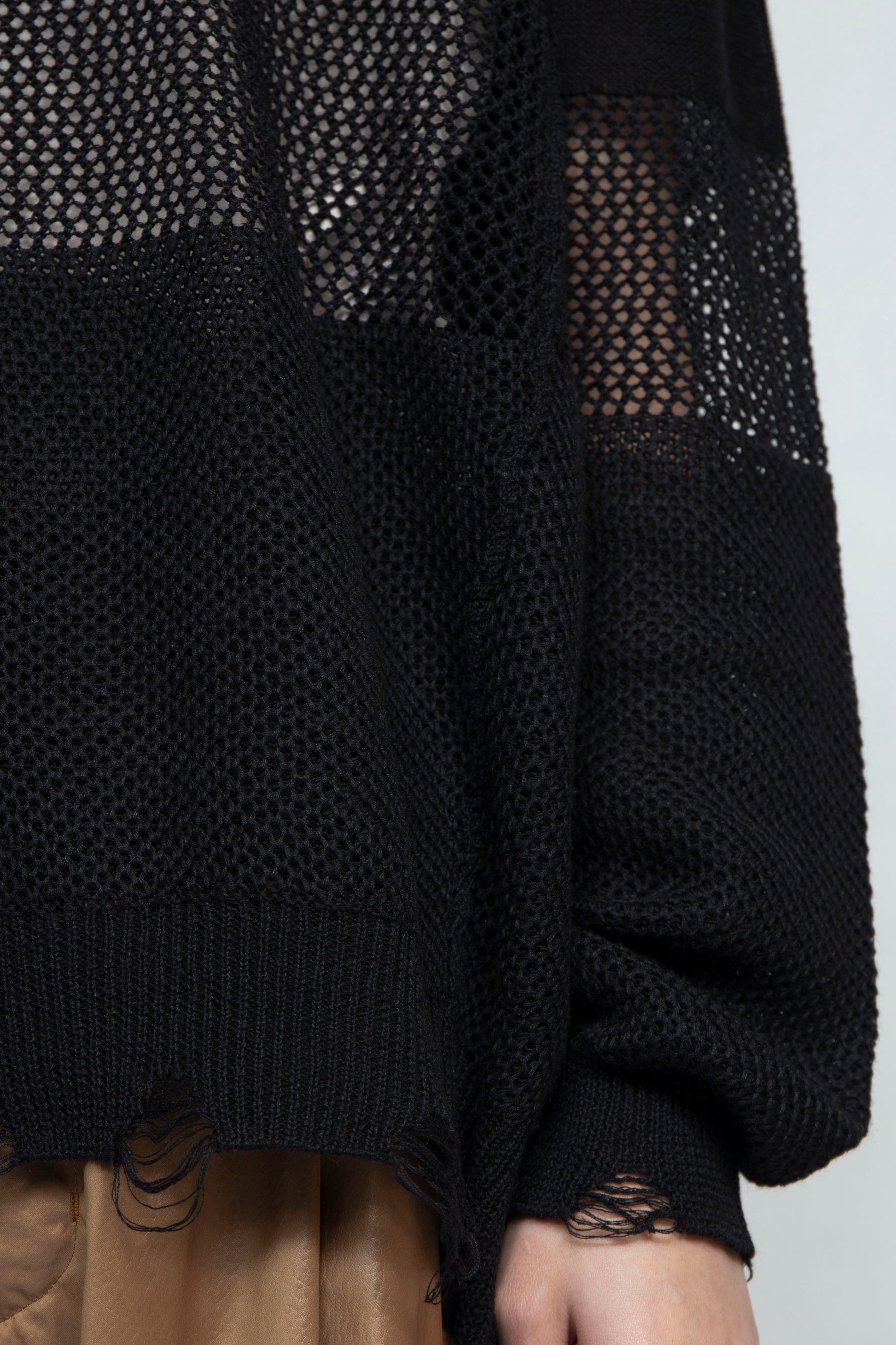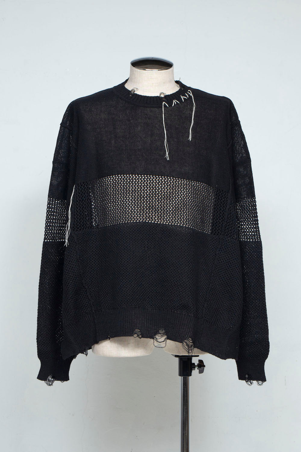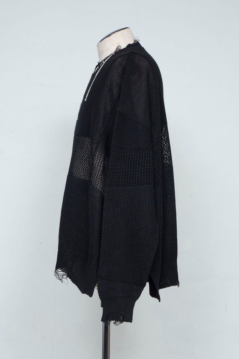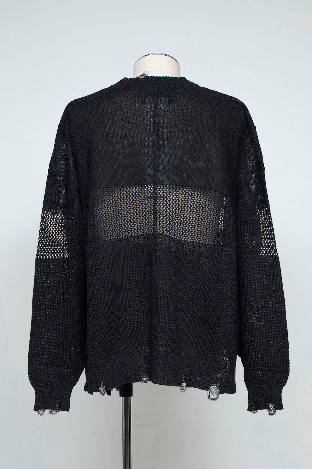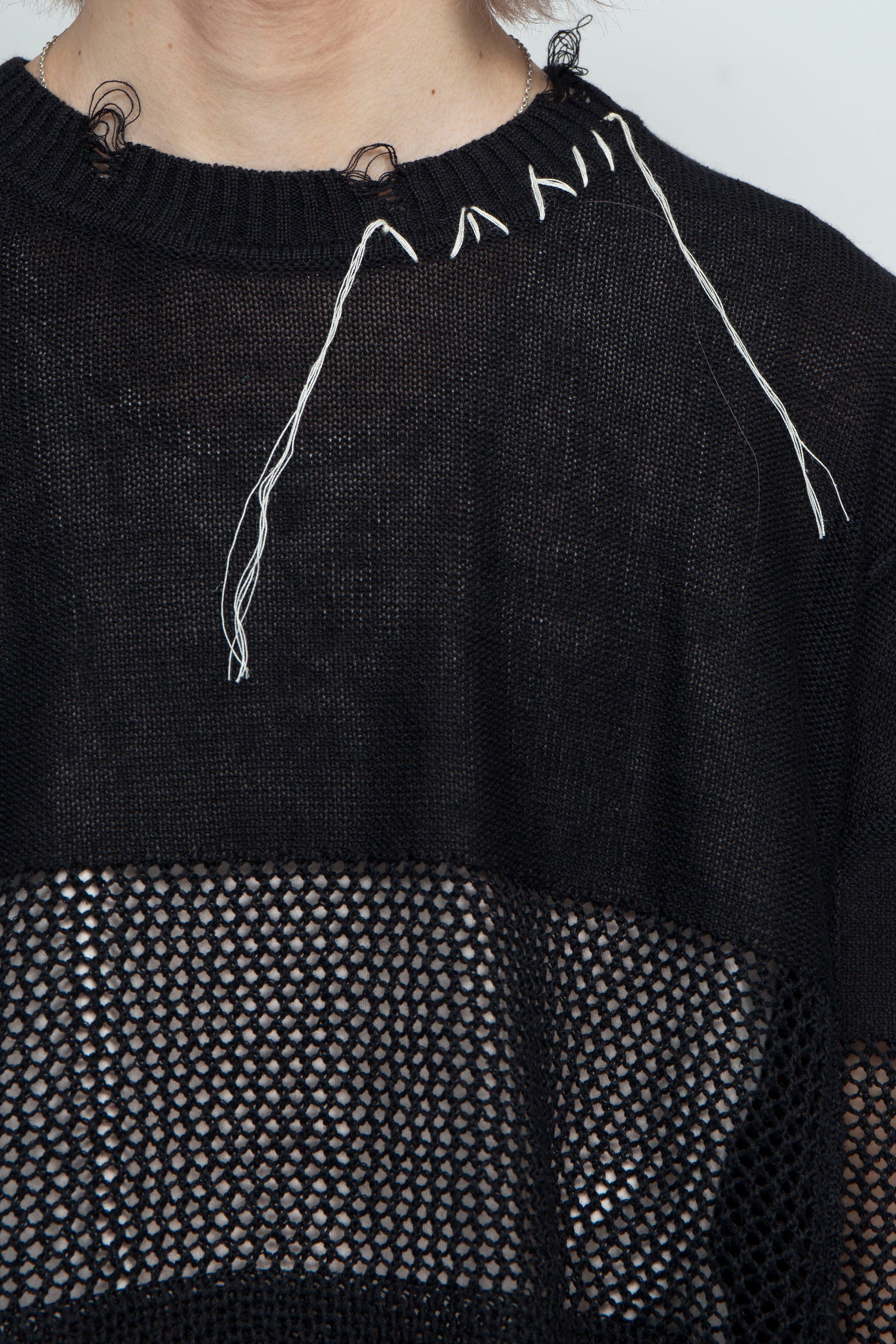 The three-layered, re-knitted distressed summer knit, which was very well received after its launch in last season's capsule collection, is available this season as a long-sleeved model that can be worn like a long-sleeved T-shirt.