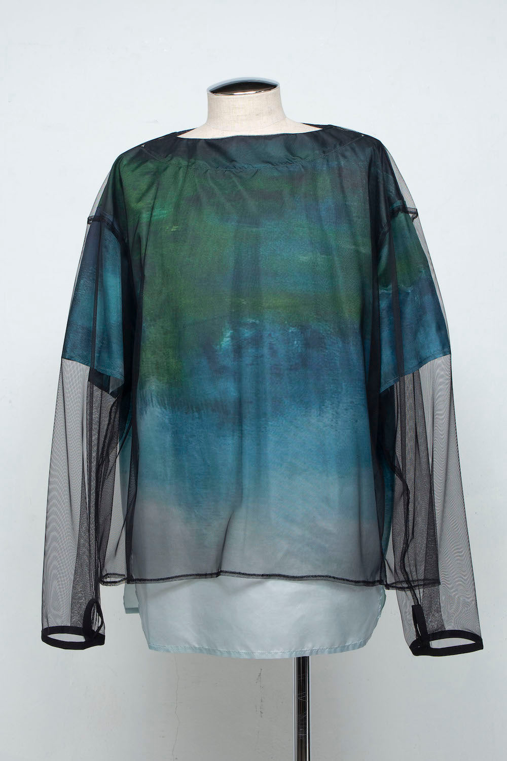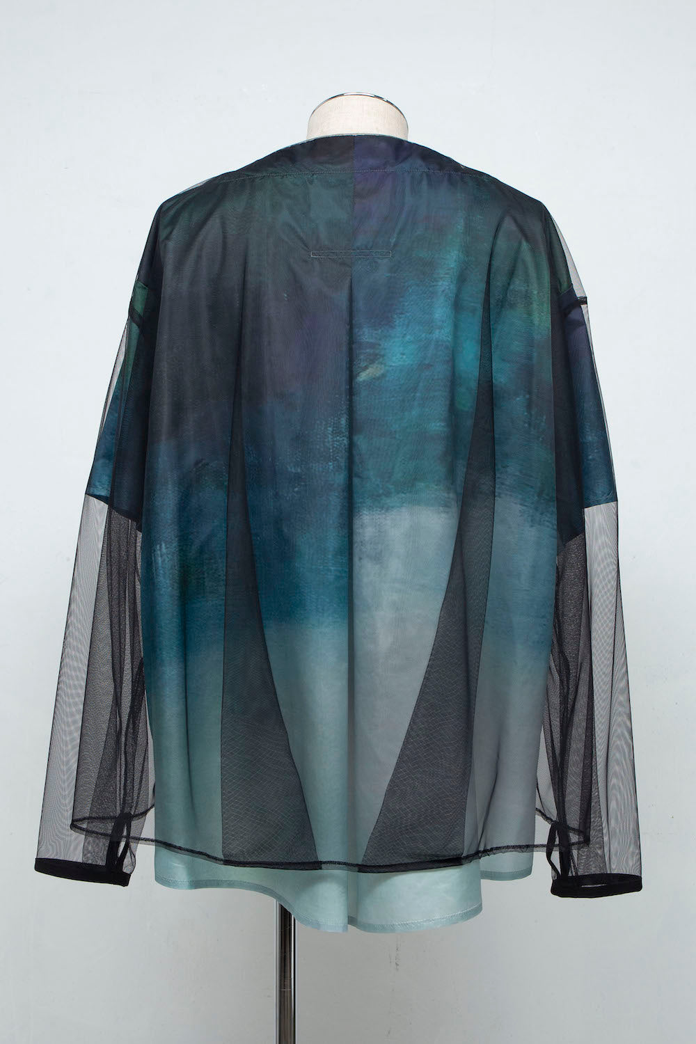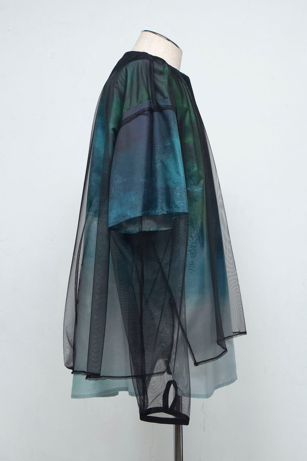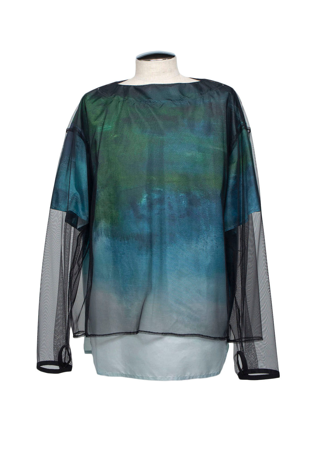 This 3D graphical tulle layered shirt is made of original printed taffeta and RECOTEX® tulle, and depicts the designer's idea of a "healing" landscape in an oil painting style.