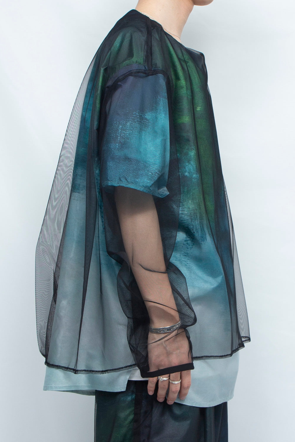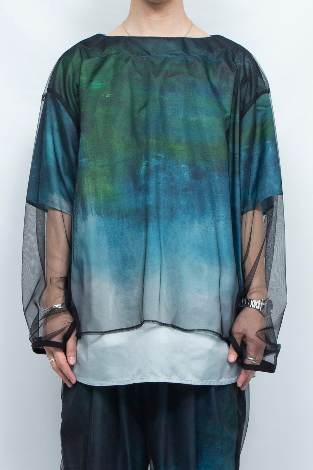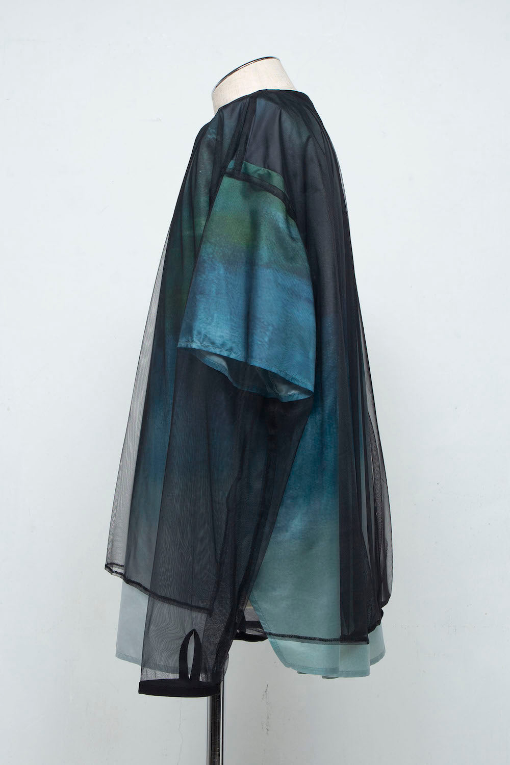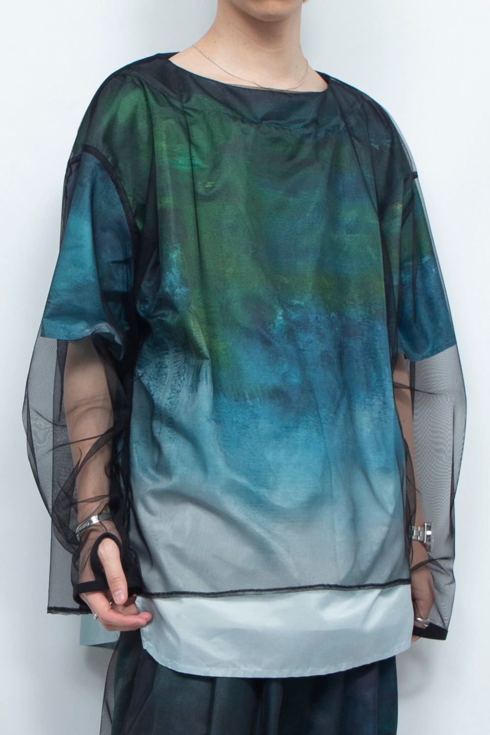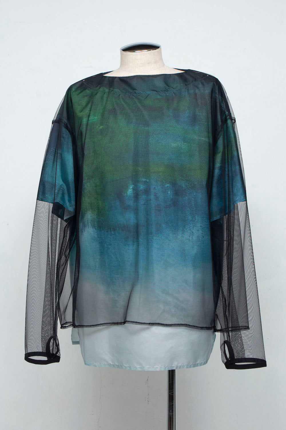 This 3D graphical tulle layered shirt is made of original printed taffeta and RECOTEX® tulle, and depicts the designer's idea of a "healing" landscape in an oil painting style.