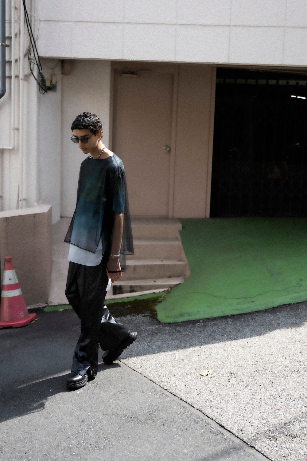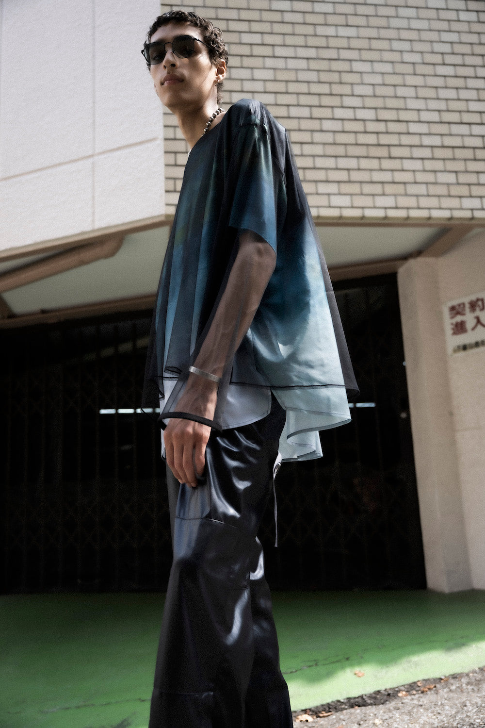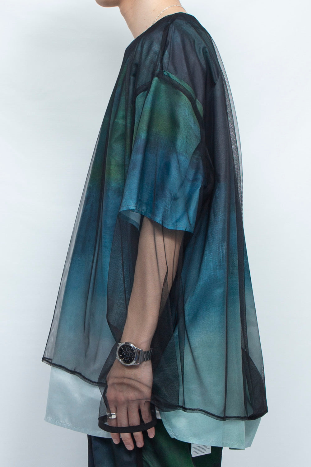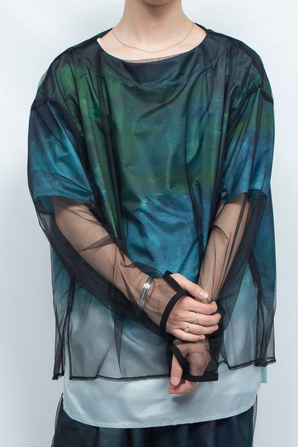 This 3D graphical tulle layered shirt is made of original printed taffeta and RECOTEX® tulle, and depicts the designer's idea of a "healing" landscape in an oil painting style.