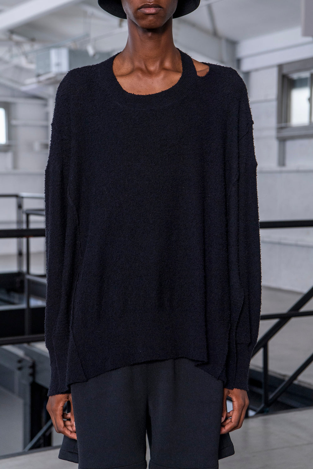 ピンチョスという特殊な髭糸(糸の表面自体にヒゲのような毛羽がある糸)を採用した、新作のオーバーサイズ ニットプルオーバー。