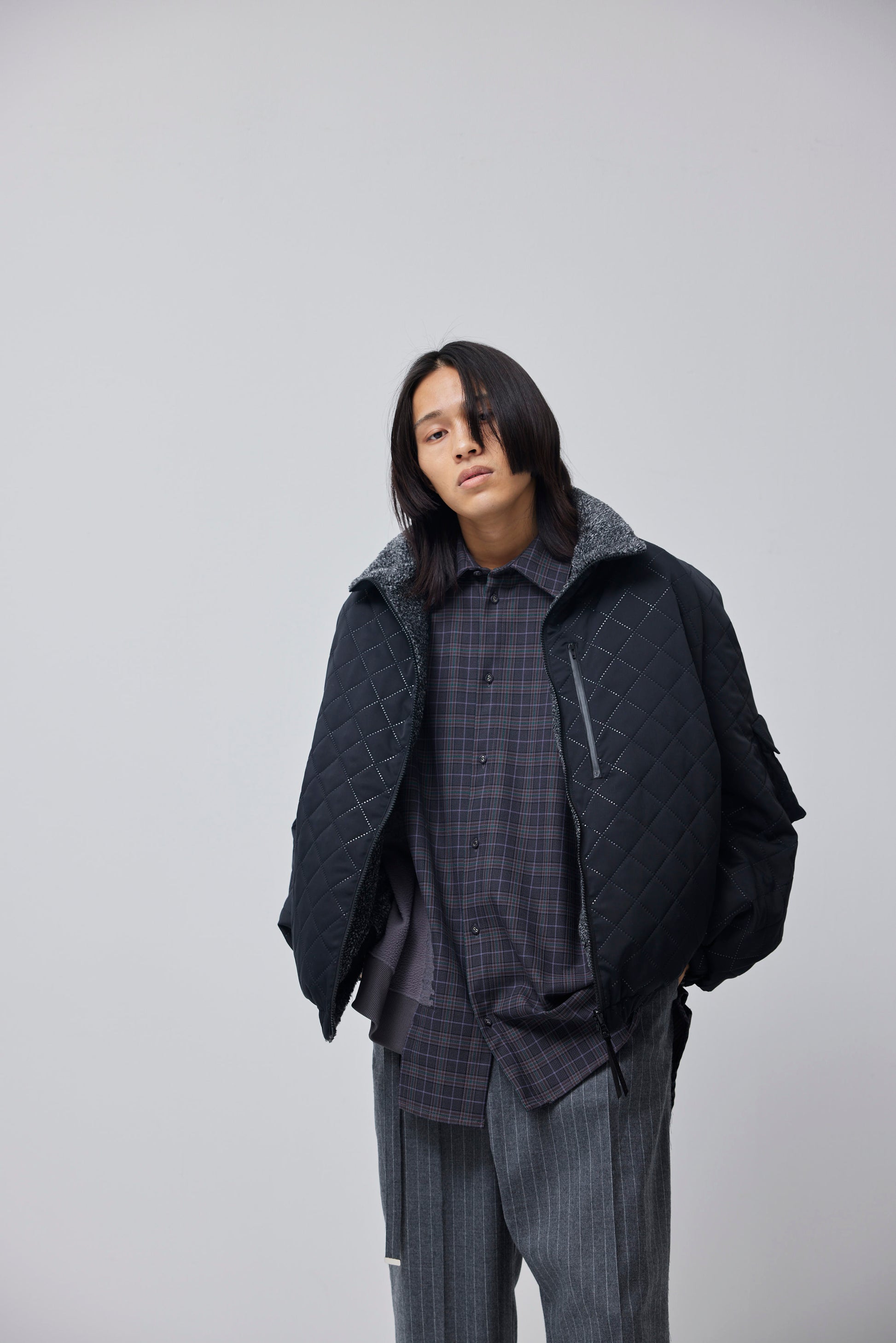 裏側には短毛のパイル生地を使用。ボアに比べて毛足が短く、軽量かつ肉厚すぎないのがポイント。 キルティングとボアのリバーシブルですが、非常にライトな着心地で、なおかつ着膨れも軽減されています。