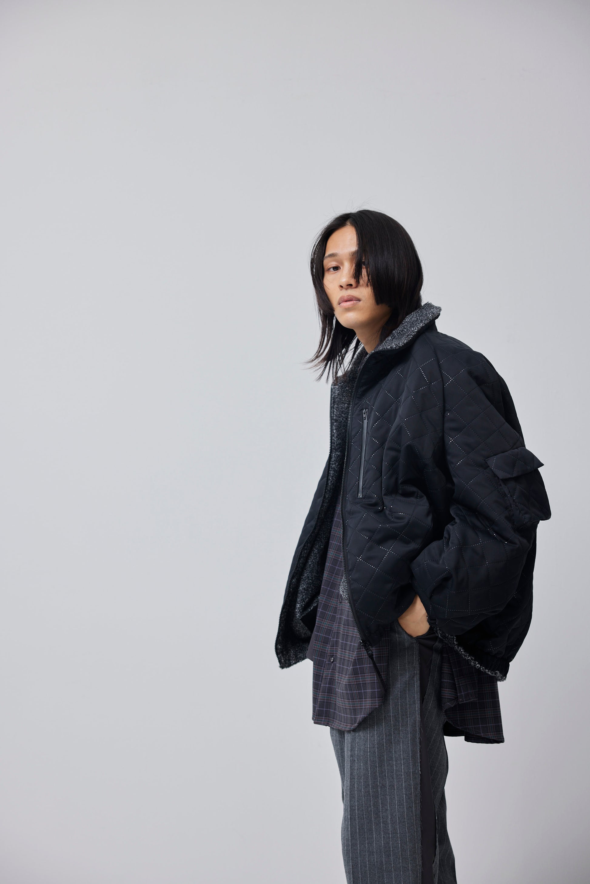 ブランド別注キルティング素材を使用したリバーシブルハイネックブルゾン。