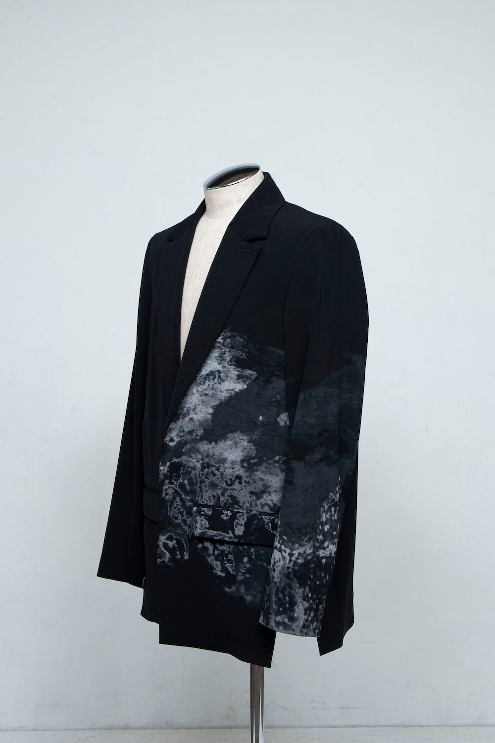シュリンク加工の工程を応用したプリントで抽象画を表現したソリビアツイルによる新型2Bテーラードジャケット。