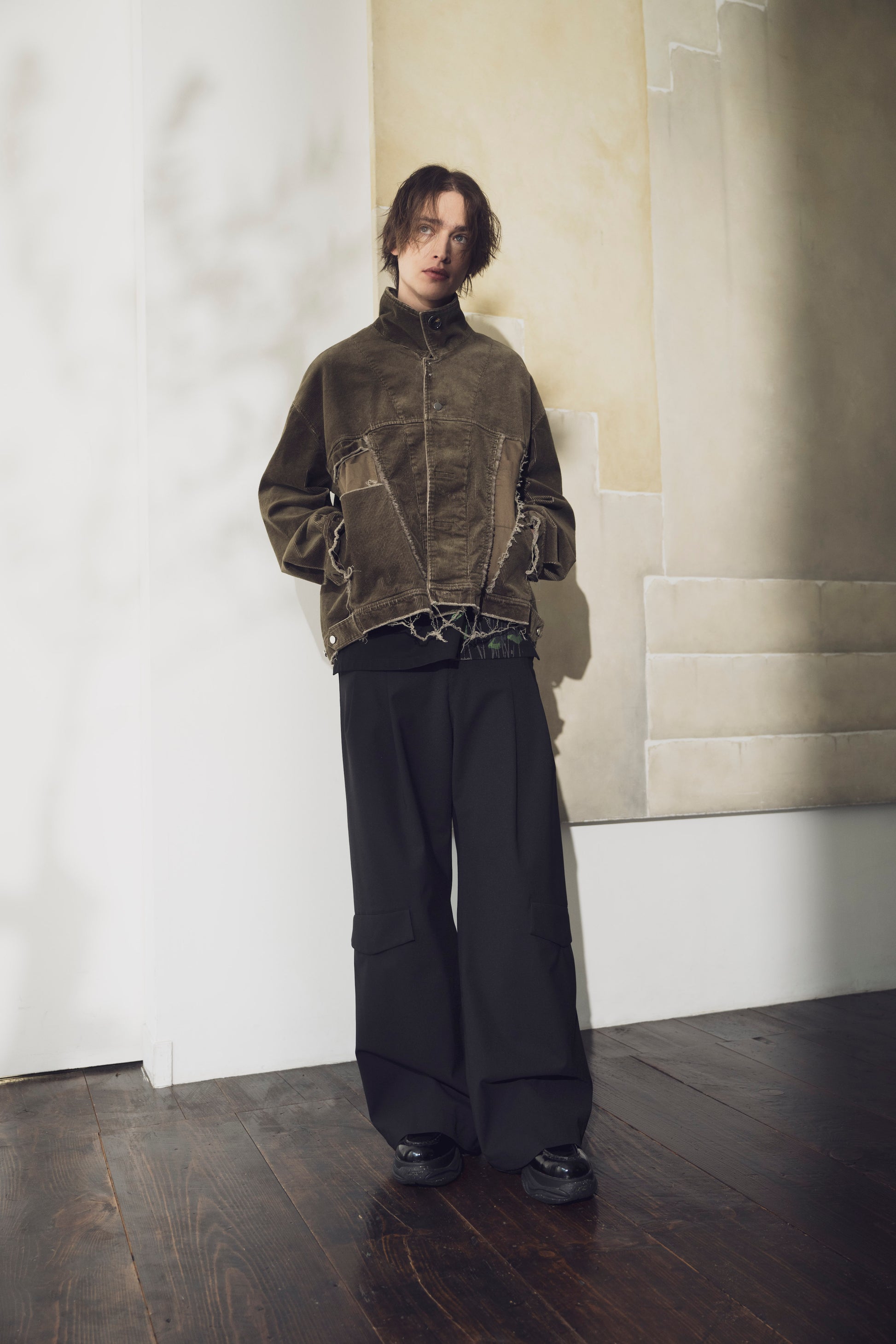 ボディは今季いちから取り組んだ最新作のバギータイプトラウザー。洗練されたワイド感をテーマに、着用時の美しいシルエットにこだわって トワル作成をなんども繰り返した渾身の一着です。スネ部分に配置されたフラップポケットもポイント。実際にポケットの機能ありです。 とにもかくにも、今後イチオシしたい一本です。ぜひご着用の上、そのシルエットをお確かめくださいませ。
