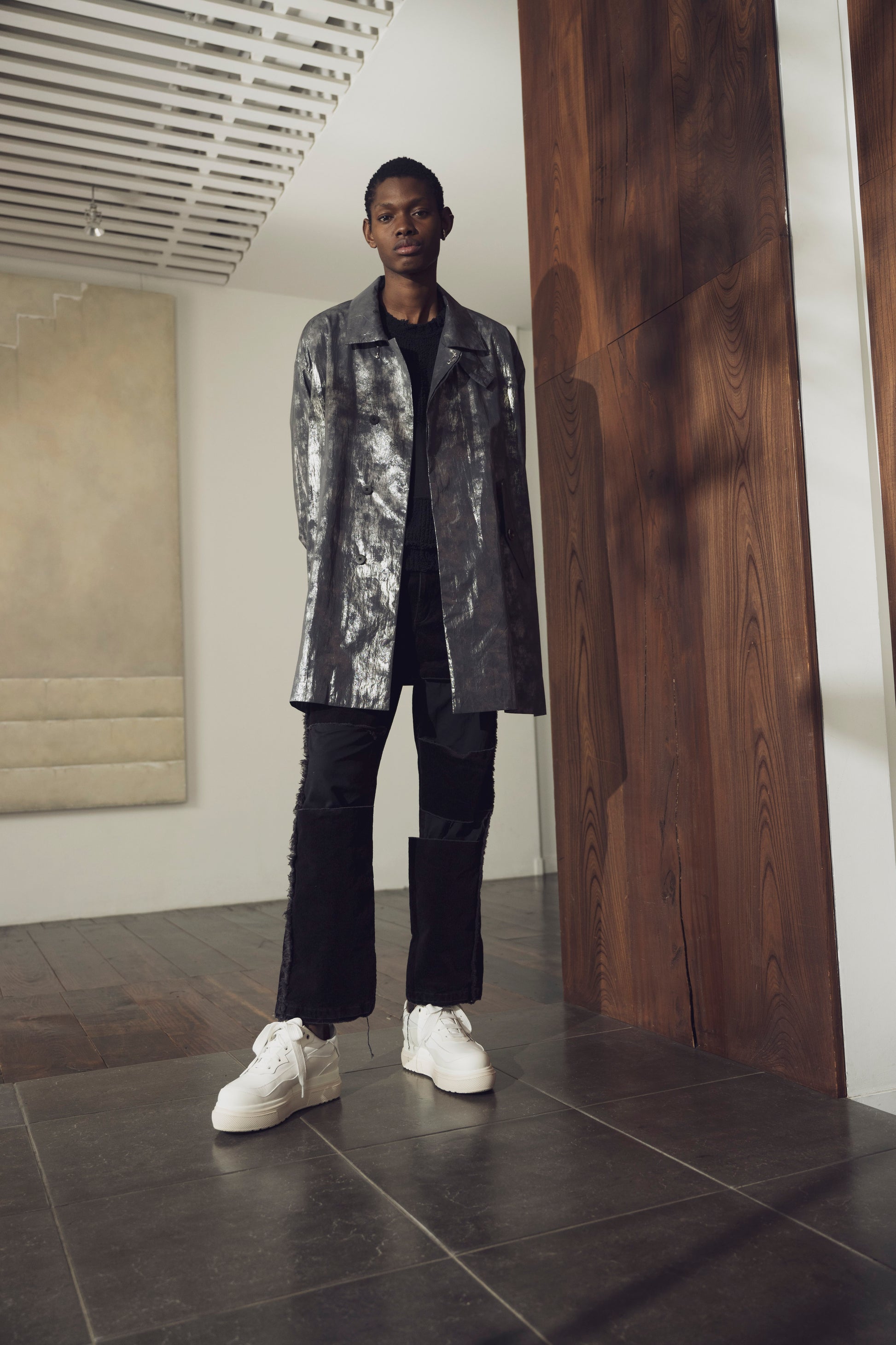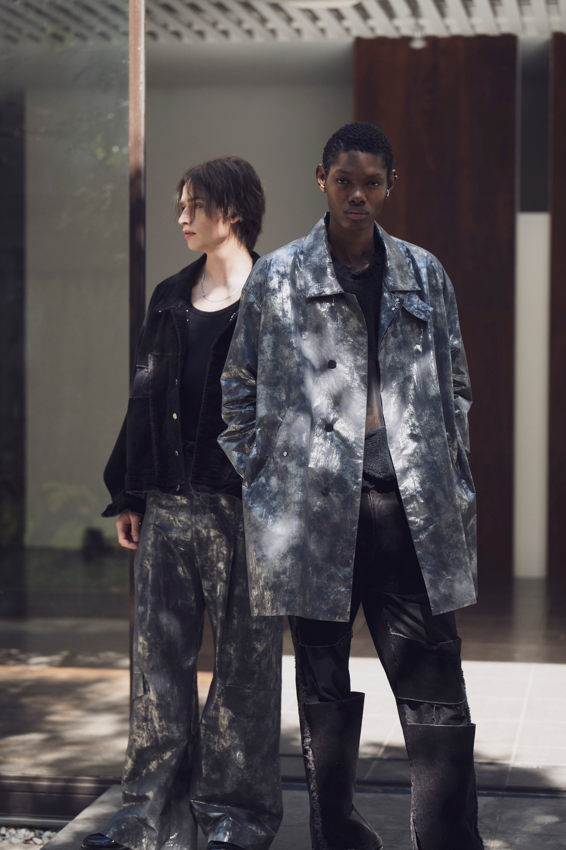 ブルーミングしたタフタ生地に原反の状態で箔プリントを施します。箔プリントでフラットに仕上がった生地を原反状態でワッシャー(洗い加工) し、中温タンブラーで乾燥させることで、洗いによって箔を適度に剥がし、タンブラーによって表面感がうまれ、まるで古びたスチールの ような表情に仕上がります。