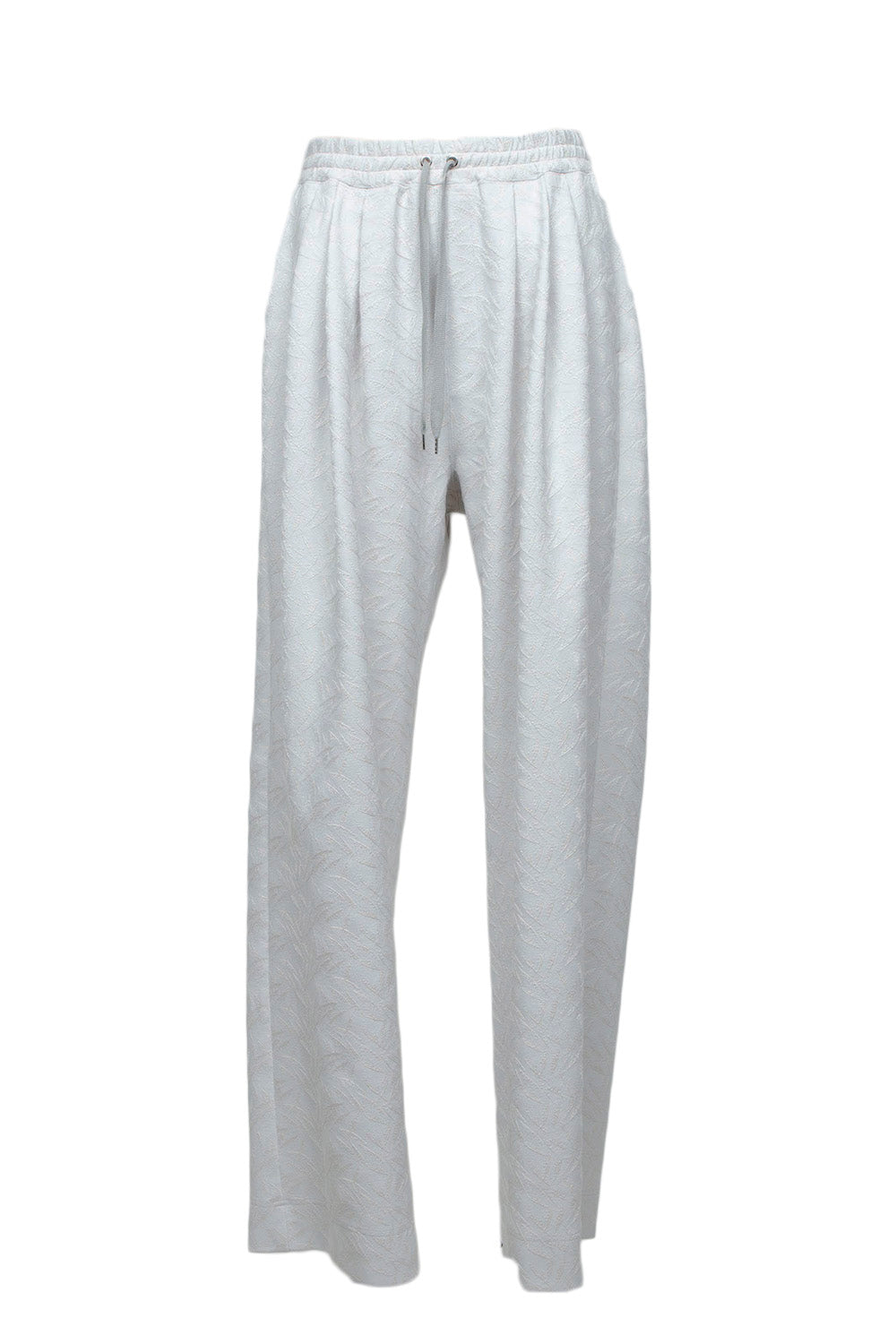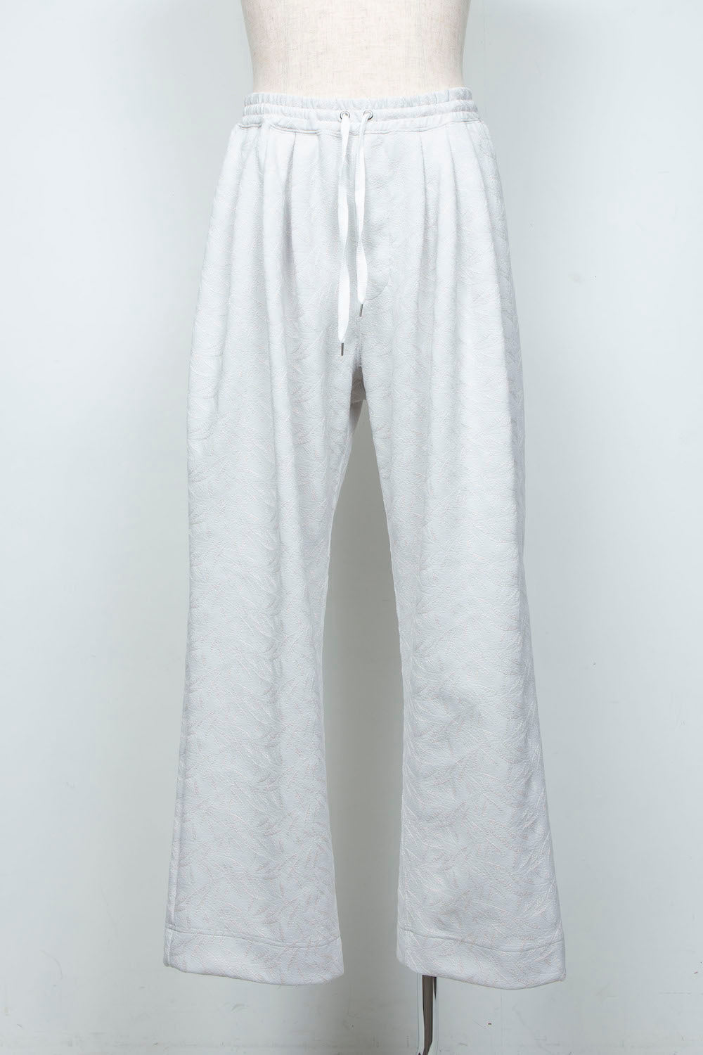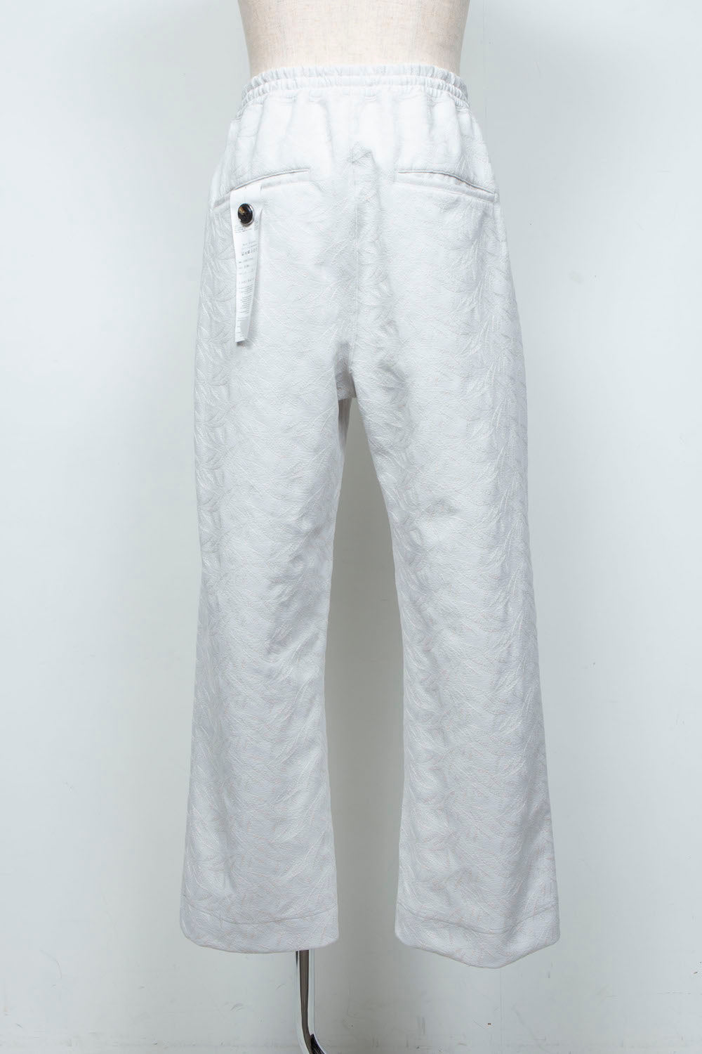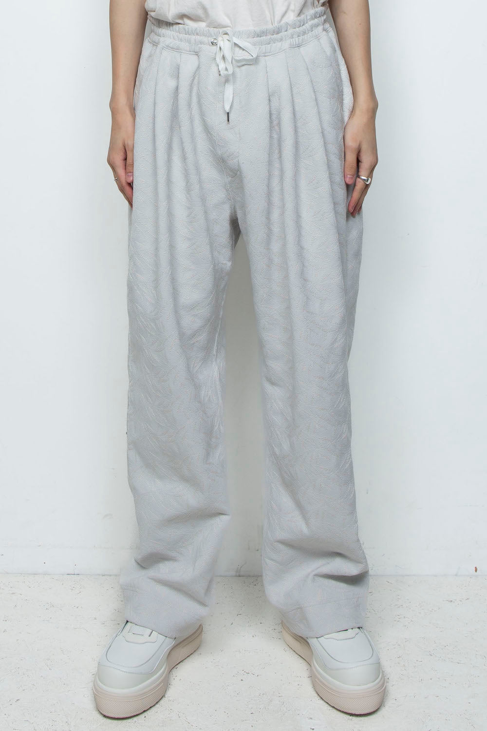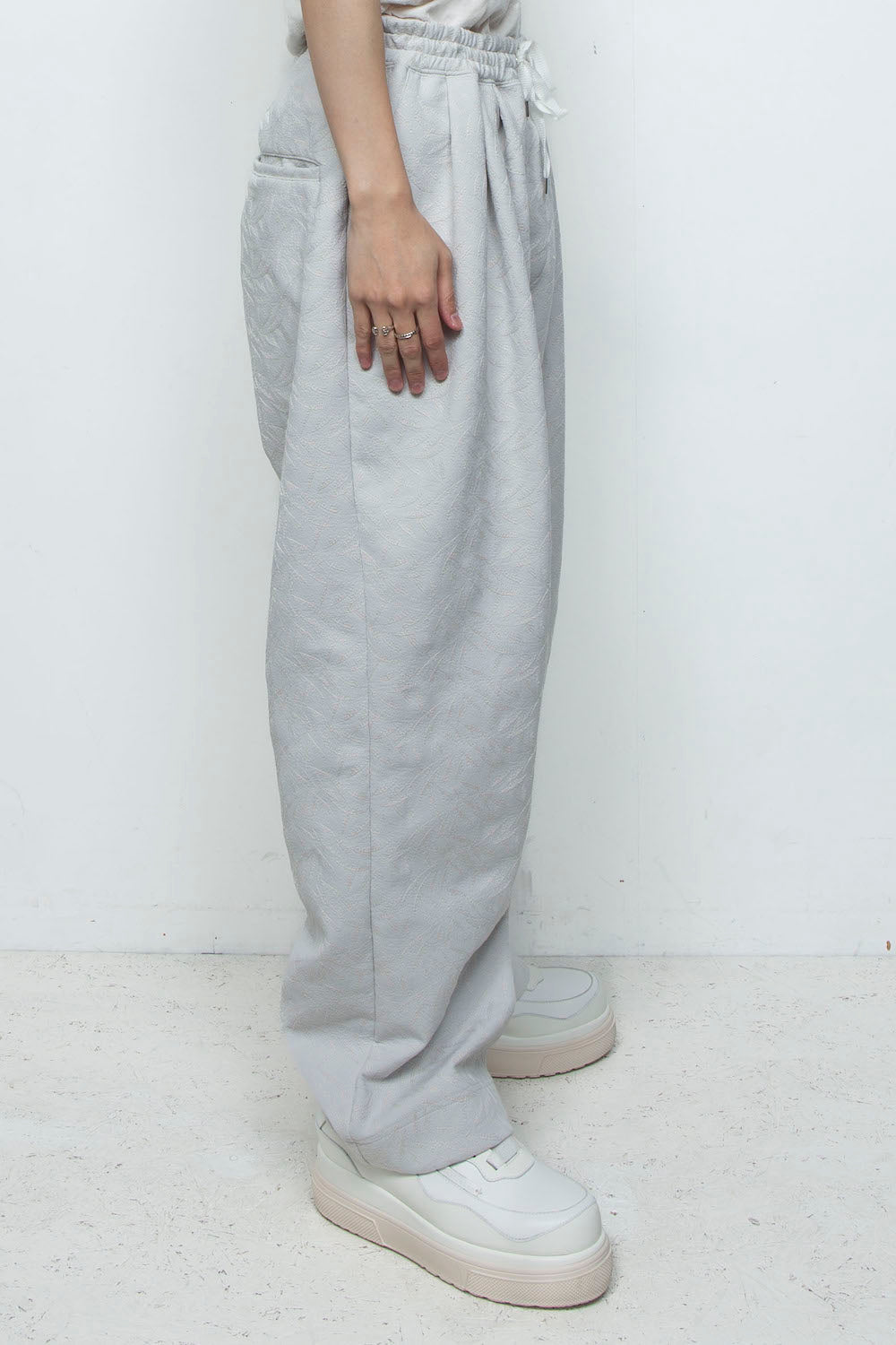 ツイル組織のドライクールジャージーに原反刺繍を贅沢に施したオリジナルファブリックによる3タックイージートラウザー。